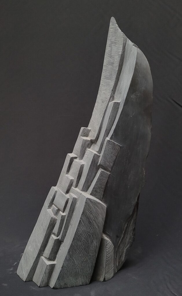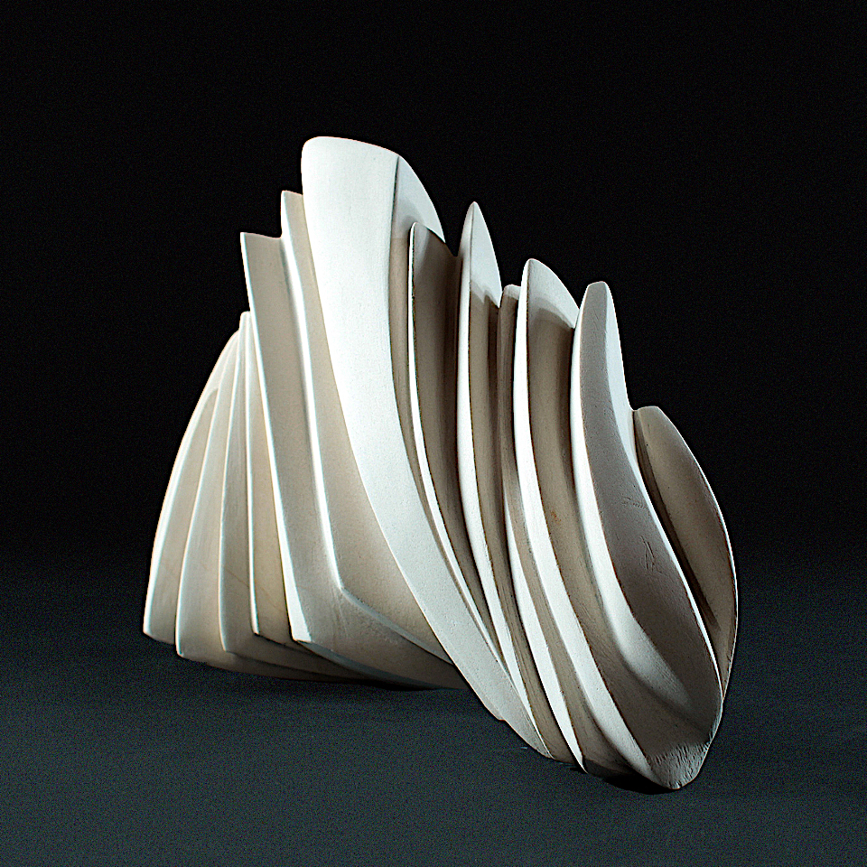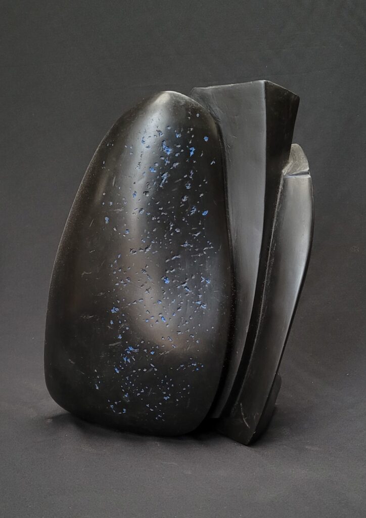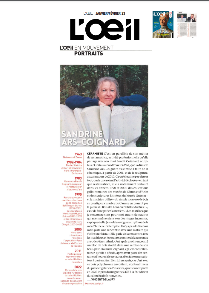 Chez Sandrine, tout est finalement sculpture, depuis les premières grandes statues figuratives, galbées et polies, des vierges émergées d’un bois de tilleul ou d’essingang au burin, les pains de terre désormais debout et entrepris dans la masse, et les blocs durs dont les noms font voyager : pierre du Bois-des-Lens, marbre de Carrare, albâtre du Brésil. Le voyage est d’ailleurs multiple. Déjà il se devine au cœur de la taille d’un matériau qui impose sa loi : irréversibilité des coups portés, savoir-faire qui doit toujours composer sans se soumettre, déploiement d’une certaine force. Il s’éprouve ensuite dans l’invitation à tourner autour de l’oeuvre finale, qui se révèle plurielle, et l’on se surprend à ne plus savoir quel abord on préfère. Enfin, il se trouve dans le déplacement du rendu de la surface. Le traitement de la céramique ̶ dont le raku mais pas seulement ̶ détermine à l’oeil et à la main rugosité, aspérités, craquèlements, quelques passages concédant de la brillance, et établit une correspondance avec l’aspect brut de la pierre primitive qu’on ne saura jamais. Puisque celle-ci ne manifeste plus que douceur mate et poudrée, velouté opalescent, plis et replis lisses en mouvements figés, même s’ils semblent prêts à s’animer. Au terme du voyage essentiel, celui de la création.