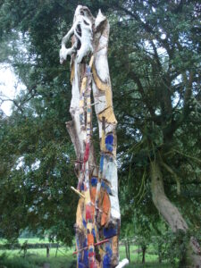 Des structures totémiques peintes dressées comme des figures emblématiques pour exprimer et ouvrir par la magie des signes et des symboles ,les espaces de nos rêves